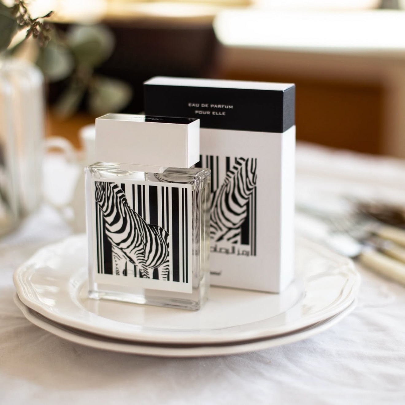 Грациозная зебра была выбрана в качестве принта на увесистом флаконе из дорого стекла.